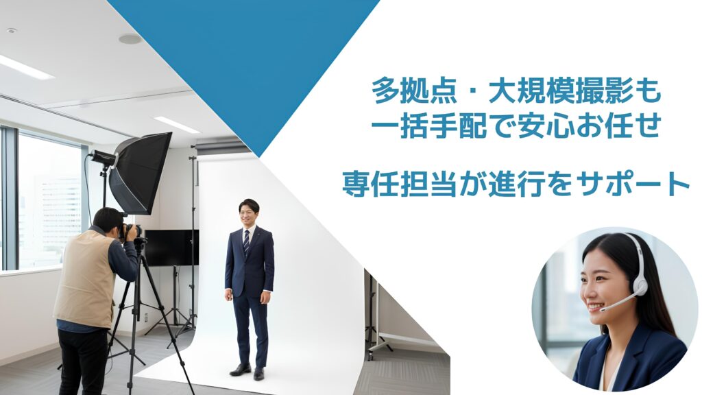 多拠点・大規模撮影も一括手配で安心お任せ。専任担当が進行をサポート